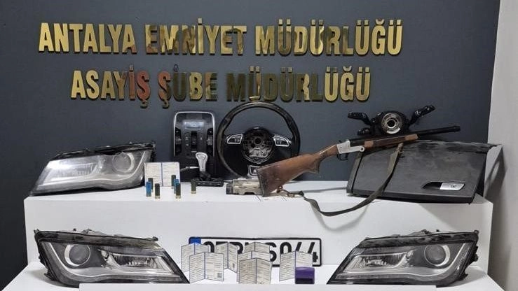 14 adet araç tescil belgesi ve 1 adet app plaka1 adet ruhsatsız av tüfeği ve 7 adet kartuş fişek1 adet tescilsiz motor bloğu,1 adet ön göğüs tertibatı, ön konsol, direksiyon ve farlar.Emniyetteki işlemlerinin ardından adli makamlara sevk edilen şüphelilerden 4 şahıs tutuklanırken, 2 şahıs hakkında ise adli kontrol kararı uygulandı. Şüpheliler, "Oto Hırsızlığı," "Resmi Belgede Sahtecilik" ve "Nitelikli Dolandırıcılık" suçlarından yargılanacak.