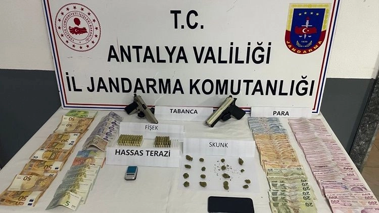 OPERASYONDA UYUŞTURUCU MADDE VE SİLAH ELE GEÇİRİLDİYapılan detaylı aramalarda; 50 gram skunk maddesi, 1 adet hassas terazi, 2 adet ruhsatsız tabanca ve bu silahlara ait 82 adet fişek ele geçirildi. Ayrıca suçtan elde edildiği değerlendirilen 1465 euro, 110 pound ve 14 bin 50 TL nakit para ile bir adet cep telefonuna el konuldu.