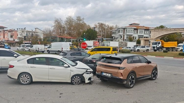 4 ARAÇ BİRBİRİNE GİRDİ: 1 YARALIKaza; Antalya-Manavgat D-400 Karayolu üzerinde Antalya istikametinden Manavgat yönüne seyir halindeki Vedat D’un kullandığı 07 AOE 263 plakalı otomobilin, kavşak içerisinde Mustafa Ö. idaresindeki 07 BPP 440, Abdurrahman K. yönetimindeki 07 KB 867 ve Uğur S. kontrolündeki 07 CHE 647 plakalı araçlarla çarpışması sonucu meydana geldi.