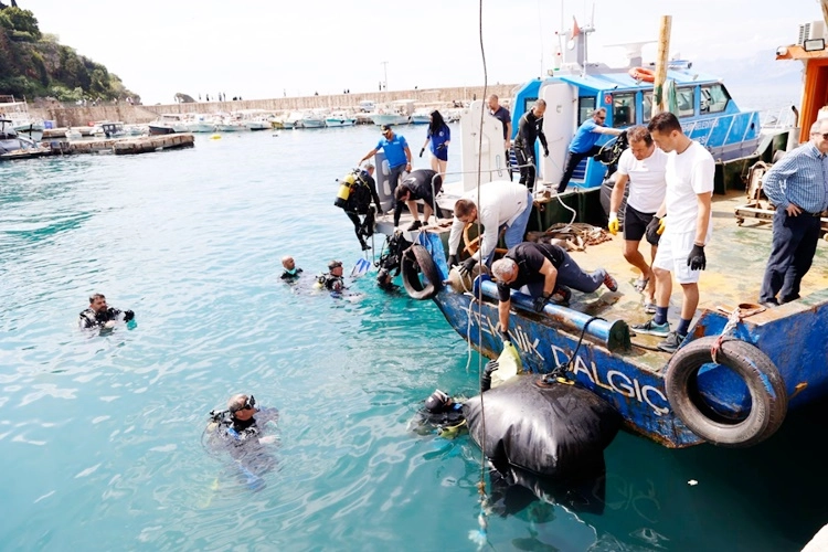 Antalya Büyükşehir Belediyesi, yaz aylarına sayılı günler kala deniz temizliğinde farkındalık oluşturmak amacıyla sivil toplum kuruluşları ve gönüllü dalgıçlarla Kaleiçi Yat Limanı’nda deniz dip temizliği yaptı. “Mavi Akdeniz” sloganıyla düzenlenen etkinlikte, bir saatlik dalış sonrası denizden çıkarılan atıklar görenleri şaşkına çevirdi.
