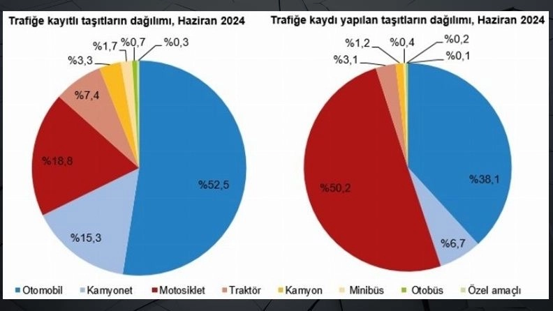 Haziran ayı sonu itibarıyla trafiğe kayıtlı taşıtların yüzde 52,5'ini otomobil, yüzde 18,8'ini motosiklet, yüzde 15,3'ünü kamyonet, yüzde 7,4'ünü traktör, yüzde 3,3'ünü kamyon, yüzde 1,7'sini minibüs, yüzde 0,7'sini otobüs ve yüzde 0,3'ünü özel amaçlı taşıtlar oluşturdu.