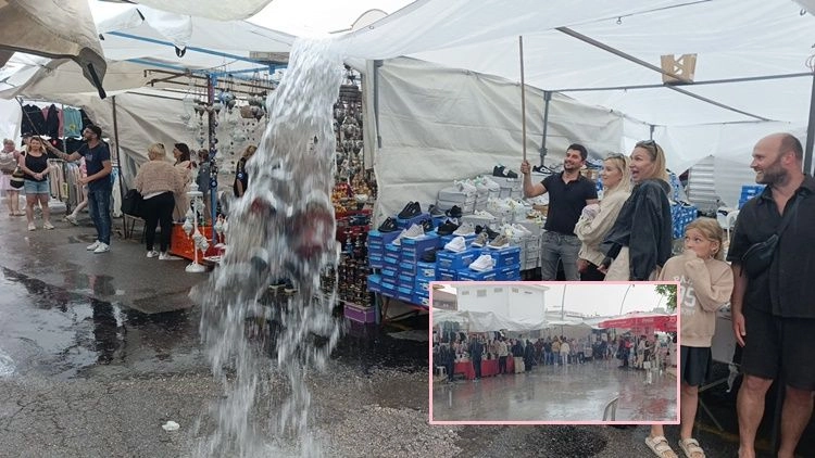 Manavgat’ta sabah saatlerinde havanın bulutlu olması turizm bölgelerindeki otellerde tatillerini geçiren turistlerin Manavgat’ın 2. Büyük açık pazarı olan Perşembe Pazarına akın etmelerine neden oldu. Sabah saatlerinden itibaren minibüslerle Manavgat’a gelen turistler, Perşembe pazarında sezonun en yoğun gününün yaşanmasına neden oldu. Perşembe pazarına akın eden turistler esnafların da yüzünü güldürürken, bir anda başlayan ve aralıklarla etkisini artırarak devam eden sağanak yağmur, esnafları tedirgin ederken turistlerin tezgahlara ve saçak altlarına sığınmasına neden oldu. Yağmurun uzun sürmesi nedeniyle bazı turistlerin yağmura aldırış etmeksizin yollarına devam ettiği gözlendi. Şiddetli yağmur, tezgahların çatısının su ile dolmasına neden olurken, tezgahlarının çatısının yıkılmasından korkan esnafların ellerine aldıkları sopa ve fırçalarla tezgahlarının çatısında toplanan suları boşaltmaya çalıştı. Yağmurun durmasından ümidini kesen bazı esnaflar satışa sundukları ürünleri ve tezgahlarını toplarken, aniden güneşin çıkmasıyla birlikte tezgahlarını yeniden açıp ürünlerini sergilemeye devam ettiler.