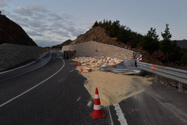 Demirkapı Tüneli girişinde Yem yüklü tır devrildi