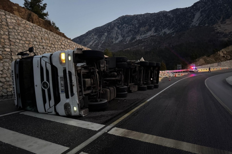 Antalya-Konya Karayolu'nda 10 ATP 245 plakalı tır Demirkapı Tüneli girişinde devrildi. Kazada şoför Himmet K. ile yolcu Estonela Ş. yaralı kurtuldu. Etrafa yem çuvalları saçıldı. Yaralılar hastanede tedavi altına alındı, hayati tehlikeleri yok.