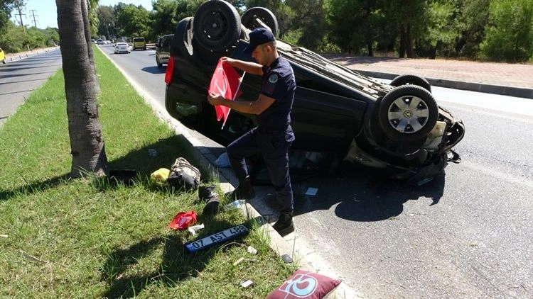 Manavgat Titreyengöl Caddesi’nde Titreyengöl istikametine seyir halindeki hafif ticari aracın refüjdeki palmiyeye çarparak takla atması sonucu meydana gelen kazada 2 kişi yaralandı. Takla attıktan sonra ters dönen hafif ticari araçtan çimlerin üzerine düşen Türk Bayrağını gören Jandarma Uzman Çavuş, bayrağı özenle dürerek jandarma aracına götürdü.