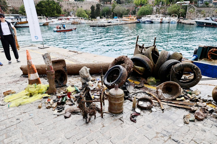 Antalya Büyükşehir Belediyesi öncülüğünde Kaleiçi Yat Limanı’nda düzenlenen deniz dip temizliğinde 30 dalgıç bir saatte 5 ton çöp çıkardı. Araç lastiğinden demir parçalarına kadar çıkan atıklar görenleri hayrete düşürdü.