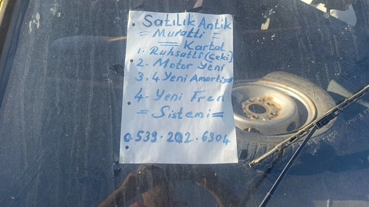 Manavgat'ta özel bir hastanenin bahçesinde park halinde bulunan Tofaş Kartal Marka, kaportasının büyük bölümü mevcut boya üzerine elle boyandığı gözlenen otomobilin arka camındaki satılık ilanı görenlerin dikkatini çekti. İlanda olduğu gibi antika durumdaki 1984 model yani 41 yaşındaki otomobilin arka camındaki ilanda ‘Satılak İntik Muratti Kartal. Çeki Ruhsatlı, Motor yeni, 4 yeni amortisör, yeni fren sistemi’ ibaresi yer alıyor. Kısa süre sonra hastanede tedavisinin ardından çıkan bir vatandaş otomobile binerken, otomobilin arkadaşına ait olduğunu belirterek “Arkadaşımın aracı 84 model ve bildiğim kadarıyla 100 bin lira istiyor. Motoru yeni, muayenesi her şeyi yeni. Sadece kasası biraz yaşlı” diye konuştu.