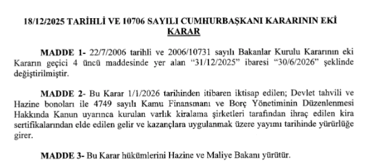 Yapılan bu değişiklikle; özellikle devlet tahvili, Hazine bonosu ve varlık kiralama şirketleri tarafından ihraç edilen kira sertifikalarından elde edilen kazançlara uygulanan mevcut stopaj oranlarının geçerliliği 30 Haziran 2026 tarihine kadar uzatılmış oldu. Düzenleme, yatırımcıların vergi avantajlarından yararlanmaya devam etmesini hedefliyor.