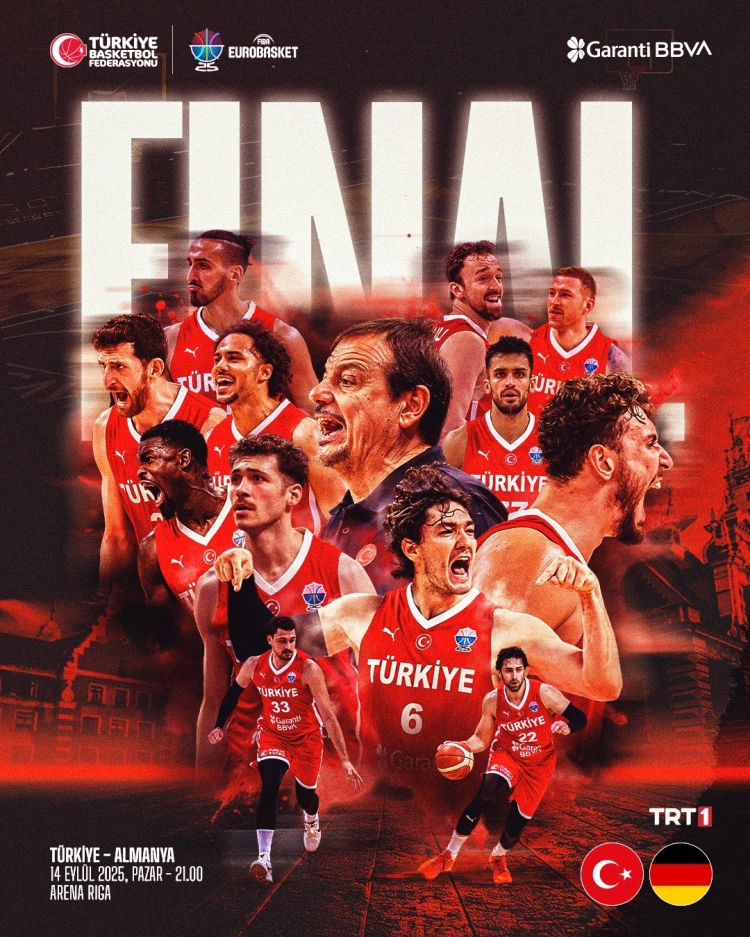 A Erkek Milli Basketbol Takımı, FIBA 2025 Avrupa Şampiyonası finalinde Almanya ile şampiyonluk için mücadele edecek. Maç, bugün saat 21.00’de Letonya’nın Riga kentindeki Arena Riga’da oynanacak ve TRT1’den canlı yayınlanacak.