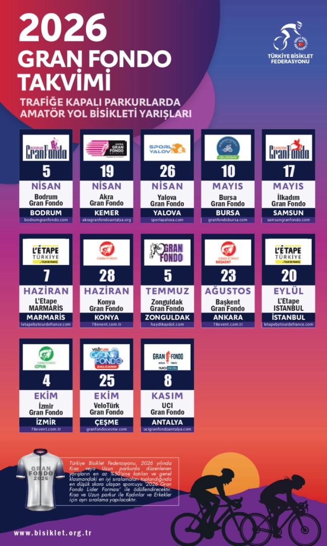 Türkiye Bisiklet Federasyonu’nun özel organizasyonlar talimatı doğrultusunda, yerel yönetimler ve özel sektör iş birlikleriyle hayata geçirilen Gran Fondo yarışları, 2026 sezonunda da amatör bisiklet sporunun ülke genelinde gelişimine katkı sunmayı sürdürecek.